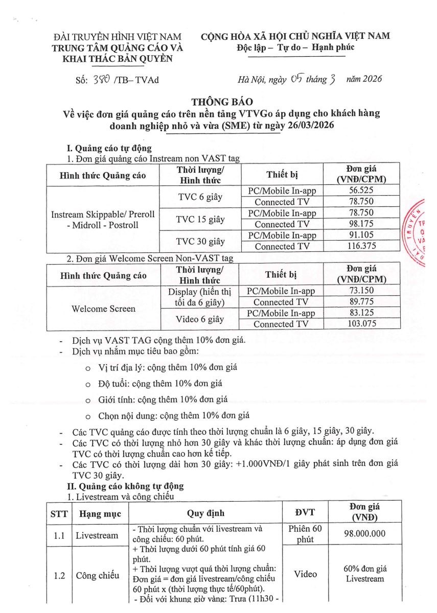 Thông báo TB380 v/v đơn giá quảng cáo trên nền tảng VTVGo áp dụng cho khách hàng DN nhỏ và vừa (SME) từ ngày 26/03/2026