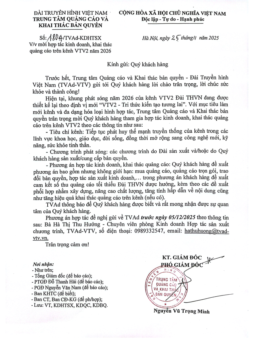 Mời hợp tác KD KT QC trên kênh VTV2 năm 2026