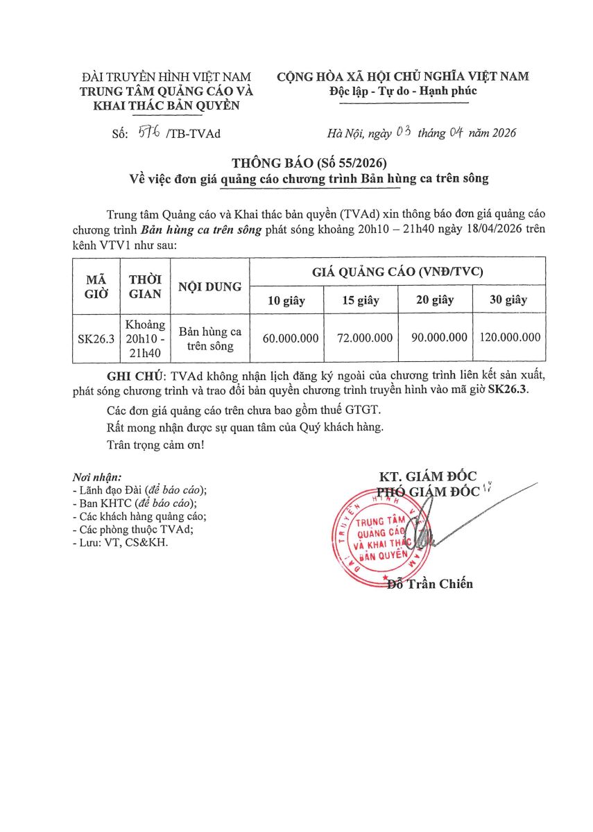 Thông báo TB55 v/v đơn giá quảng cáo chương trình Bản hùng ca trên sông 05:30 CH | 10.04.2026