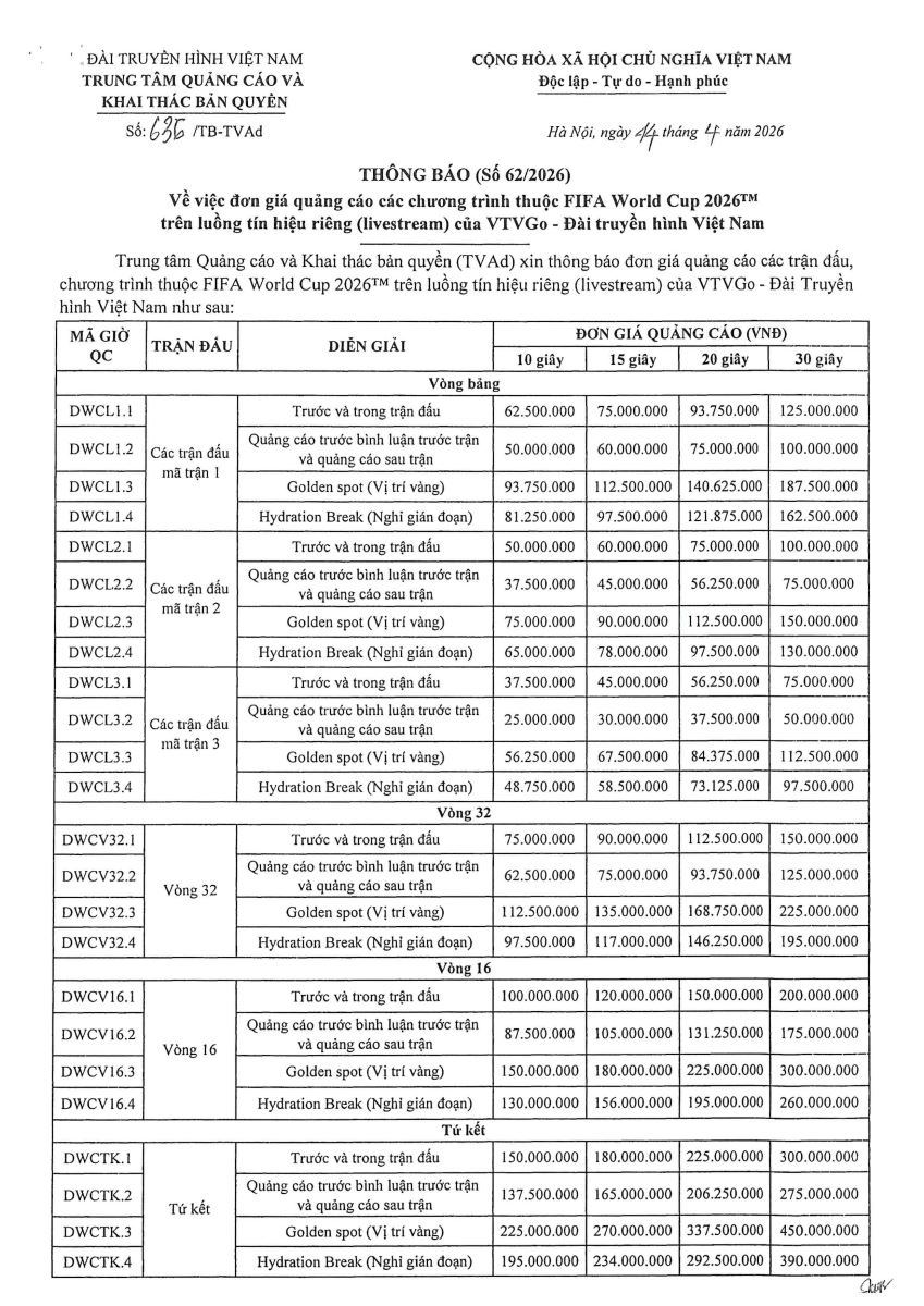 Thông báo TB62 v/v đơn giá quảng cáo các chương trình FIFA WC2026 trên luồng tín hiệu riêng (livestream) của VTVGo-Đài THVN